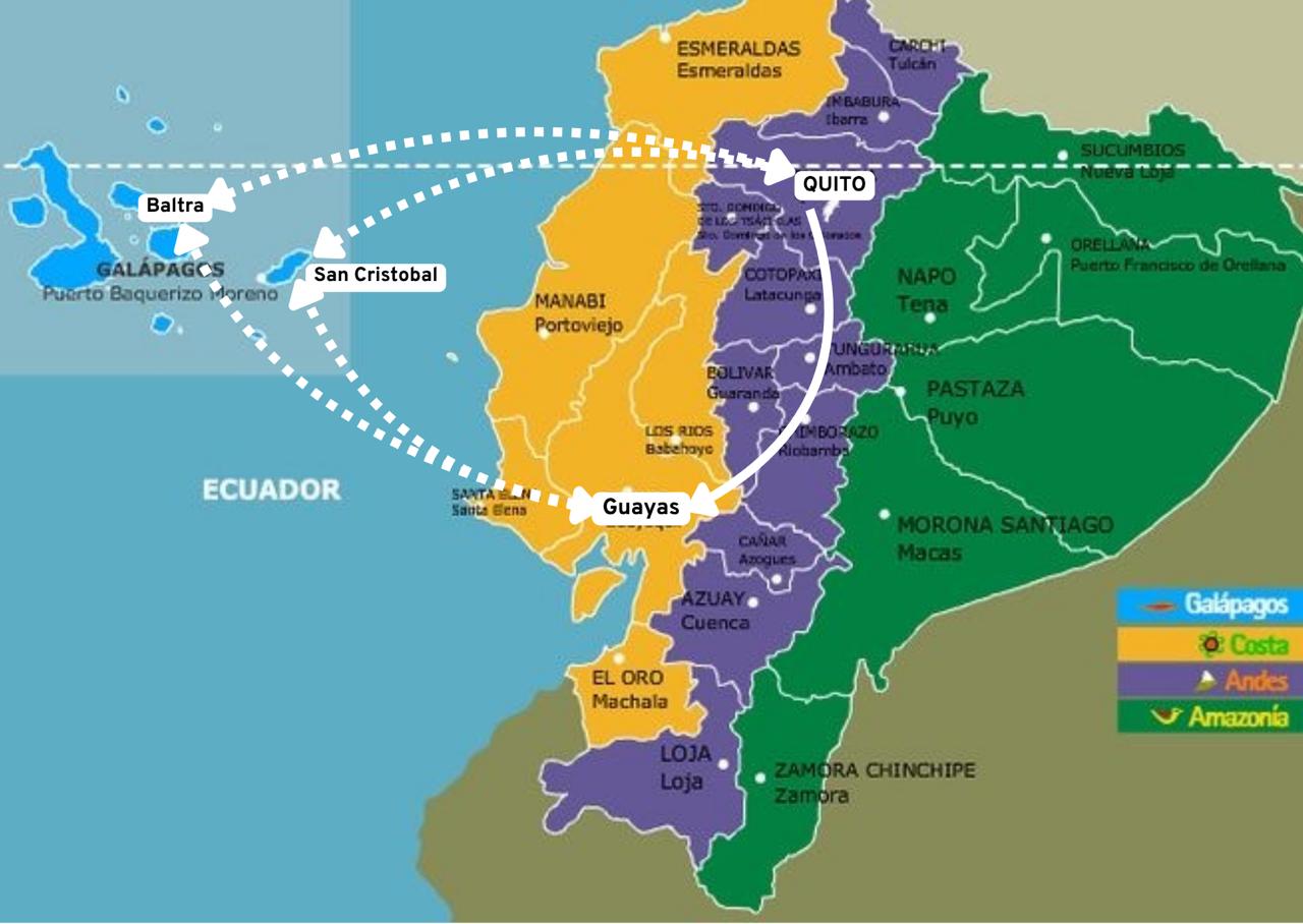 Los vuelos a Galápagos salen desde las ciudades de Quito o Guayaquil, para aterrizar en los aeropuertos de la isla de San Cristóbal o Baltra-Isla Santa Cruz. Las aerolíneas son Latam y Avianca, podemos ayudarte a realizar tus reservaciones. NOTA: El pasaje aéreo puede ser más económico de acuerdo a las temporadas altas o bajas de visita, consúltanos. Existen ventajas y desventajas al llegar a cualquiera de los dos aeropuertos en el archipiélago, nosotros podemos ayudarte para que tomes la mejor decisión de viaje de acuerdo a tus expectativas y presupuesto, contáctanos, estaremos gustosos de asesorarte.