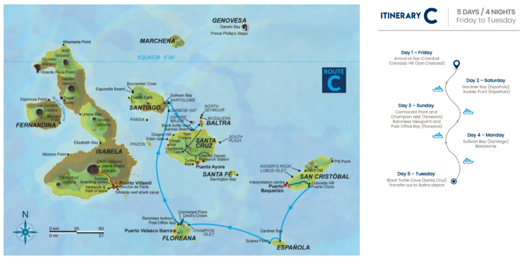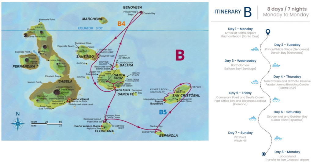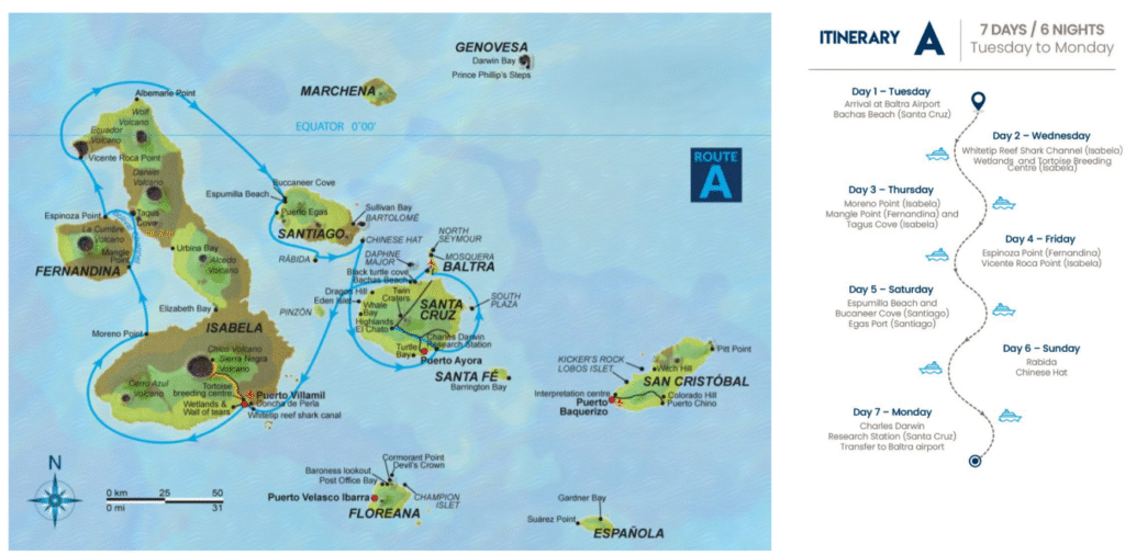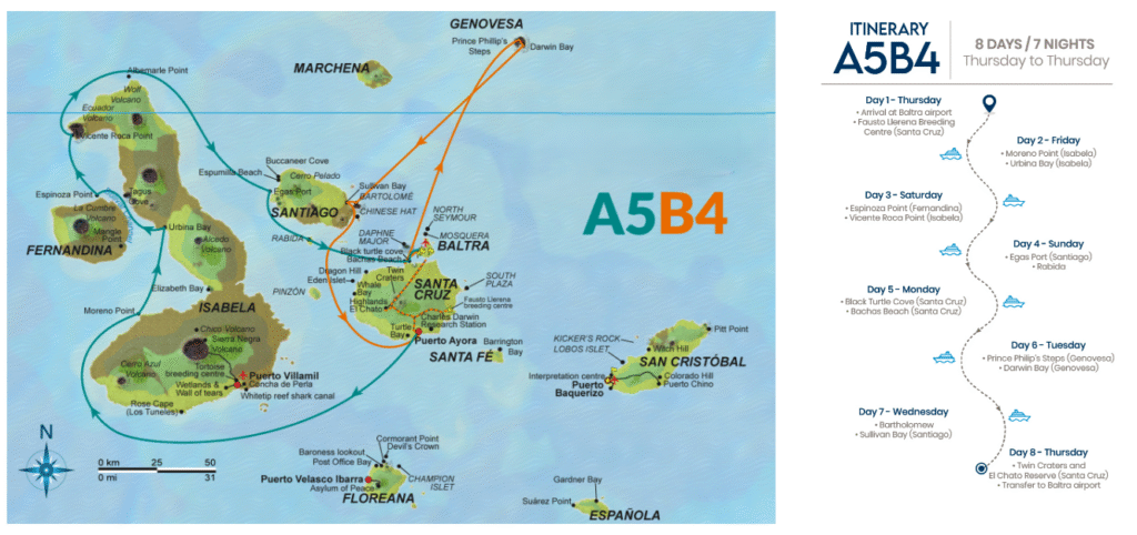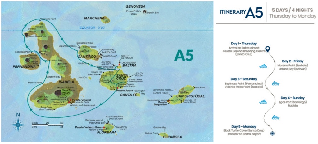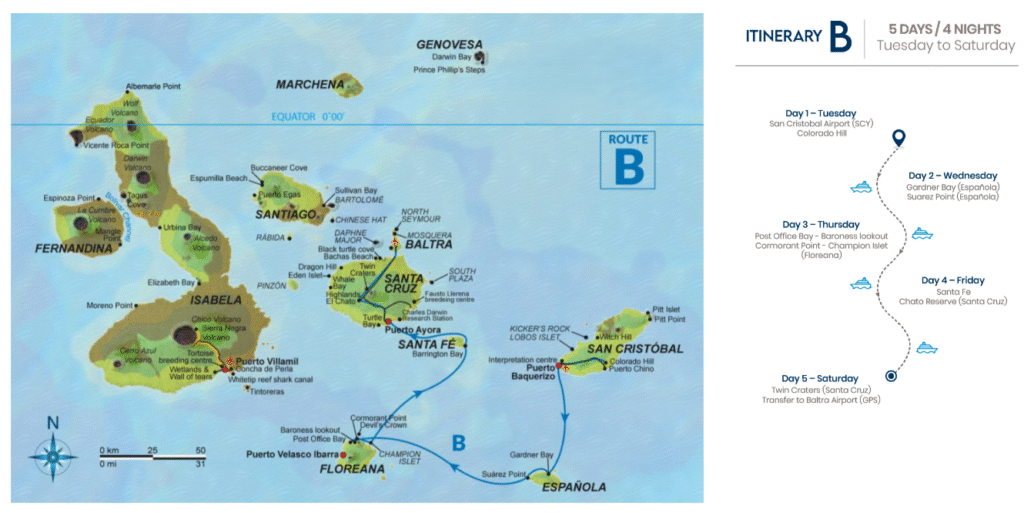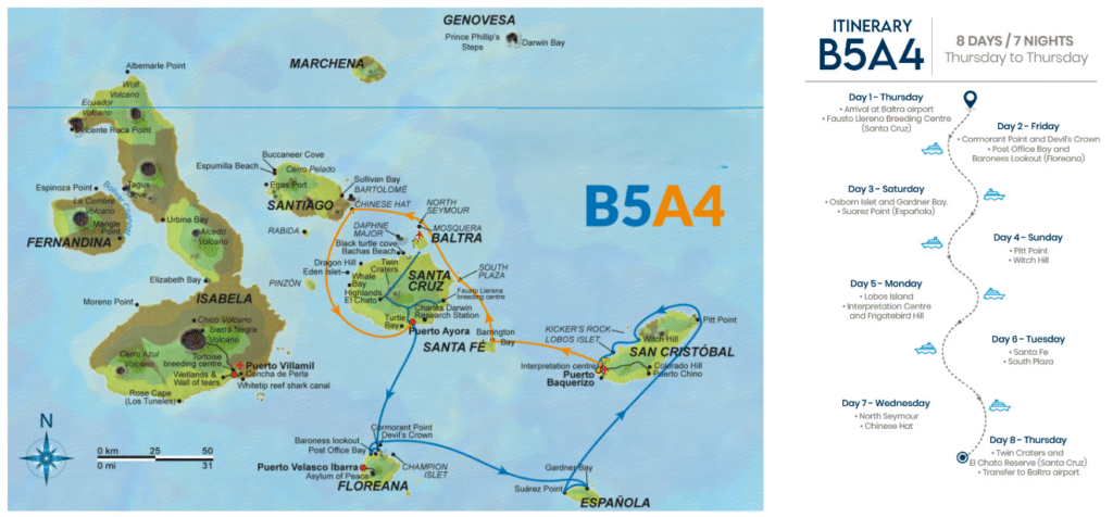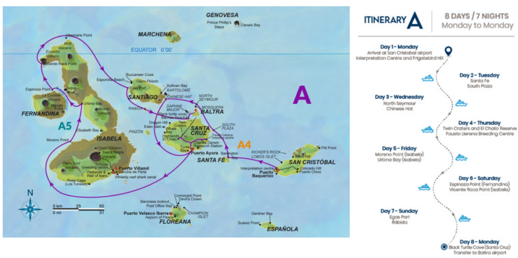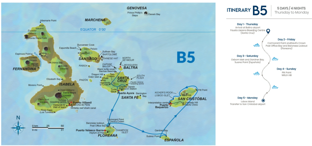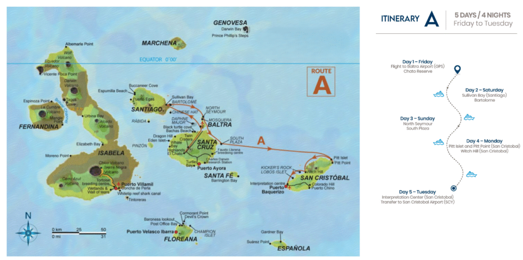 Este itinerario reúne algunos de los mejores sitios de las Islas Galápagos en cinco días, lo que brinda una buena visión general de la parte sur del archipiélago.