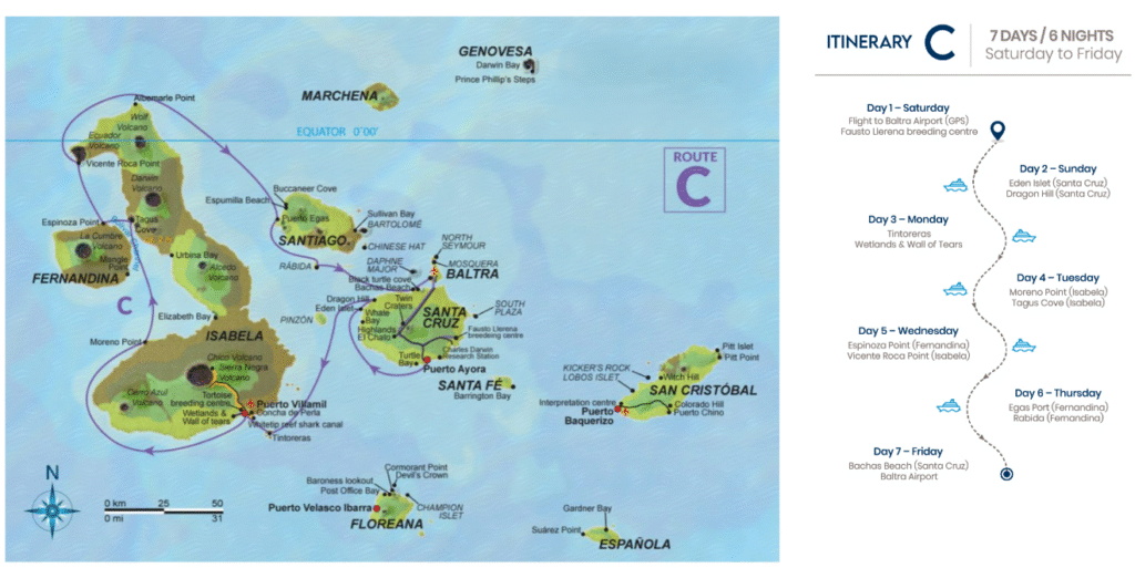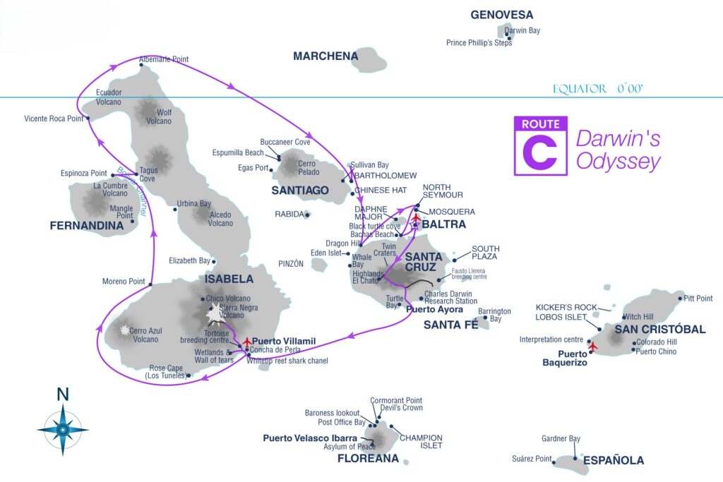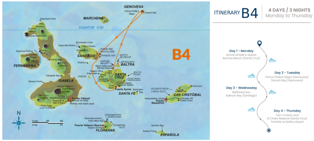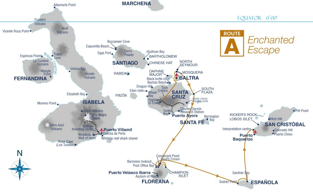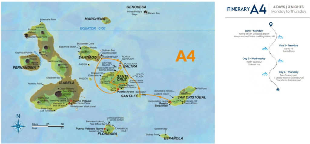 Nuestra ruta de 3 noches navega por 3 de las 4 islas habitadas del archipiélago, presentando su intrigante historia de colonización: San Cristóbal, Floreana y Santa Cruz.